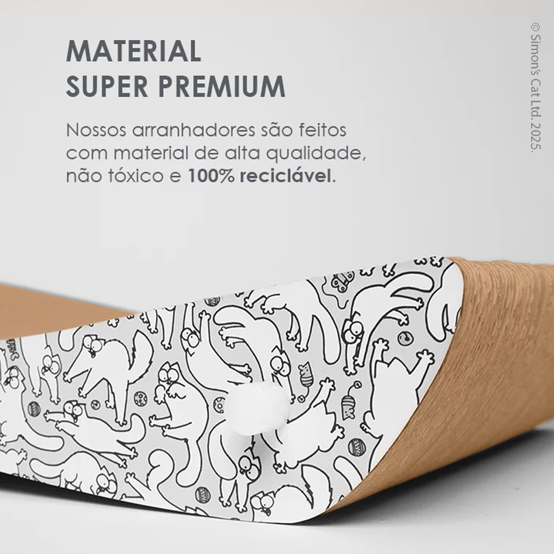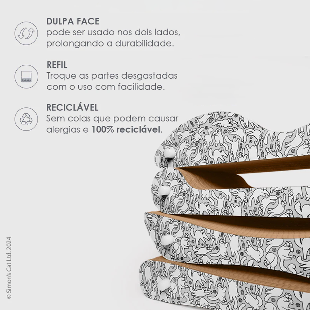 Arranhador para ajudar seu gatinho a desgastar as unhas, se alongar e se desestressar - além de proteger os seus moveis!Os dois lados podem ser usados como arranhador, trazendo maior durabilidade do produto.Arranhador Simon's Cat: além de arranhador, serve como uma caminha e um lindo lounge, amado pelos gatinhos.Material SUPER PREMIUM:- Papelão KRAFT, com qualidade e coloração diferenciada dos demais arranhadores.- Laterais em PAPEL CARTONADO ESPECIAL: traz leveza e combina com sua casa.- Sem cola entre as placas de papelão, reduzindo riscos de alergia.100% reciclável. Feito à mão, no Brasil.