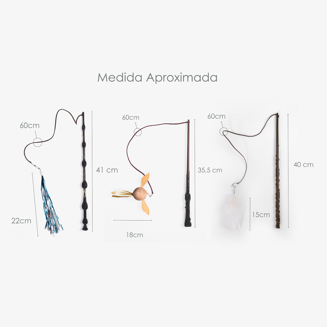 Varinha Harry Potter, vem com: - uma varinha réplica da varinha de Harry Potter; - uma cordinha extensora em elástico com ponta em metal; - uma ponta/ponteira sensorial de pelúcia pomo de ouro com catnip, sininho e fitinhas. Varinha Hermione, vem com: - uma varinha réplica da varinha de Hermione Granger; - uma cordinha extensora em elástico com ponta em metal; - duas pontas/ponteiras com penas brancas. Varinha Dumbledore, vem com: - uma varinha réplica da varinha do Professor Dumbledore; - uma cordinha extensora em elástico com ponta em metal; - duas pontas/ponteiras com fitinhas metalizadas azul/prata. Kit de pontas/ponteiras, vem com: - uma ponta/ponteira sensorial de pelúcia pomo de ouro com catnip, sininho e fitinhas (mesma que acompanha a Varinha Harry Potter). - uma ponta/ponteira com penas brancas (mesma que acompanha a Varinha Hermione), - uma ponta/ponteira com fitinhas metalizadas azul/prata (mesma que acompanha a Varinha Dumbledore). Material - Varinhas: as varinhas são feita com resina e interior em metal para proporcionar maior durabilidade e resistência. Finalidade: brinquedo interativo para gatos, uso sob subervisão.
