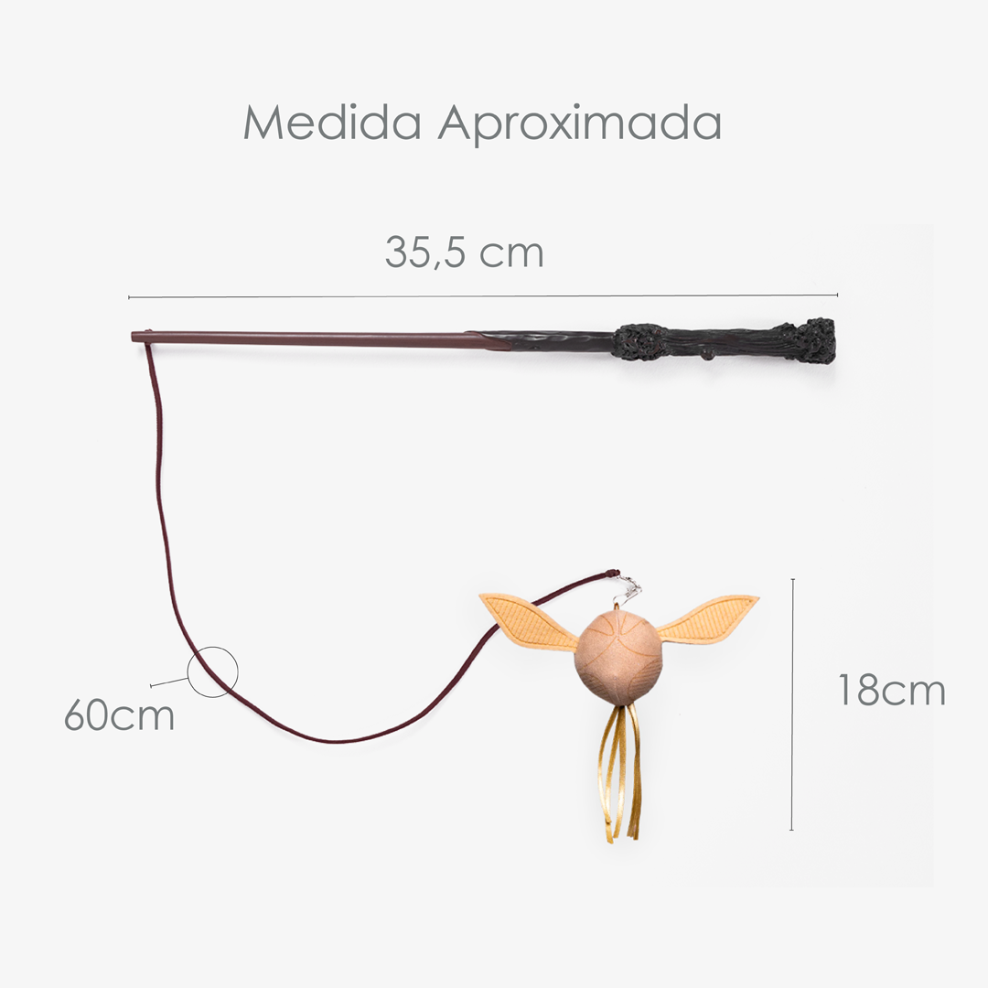 Varinha Harry Potter, vem com: - uma varinha réplica da varinha de Harry Potter; - uma cordinha extensora em elástico com ponta em metal; - uma ponta/ponteira sensorial de pelúcia pomo de ouro com catnip, sininho e fitinhas. Ponta Extra, vem com: - uma ponta/ponteira sensorial de pelúcia pomo de ouro com catnip, sininho e fitinhas (mesma que acompanha a Varinha Harry Potter). Material - Varinhas: as varinhas são feita com resina e interior em metal para proporcionar maior durabilidade e resistência. Finalidade: brinquedo interativo para gatos, uso sob subervisão.